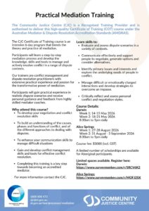 The Community Justice Centre is pleased to be offering our Practical Mediation Training in Darwin and Alice Springs.