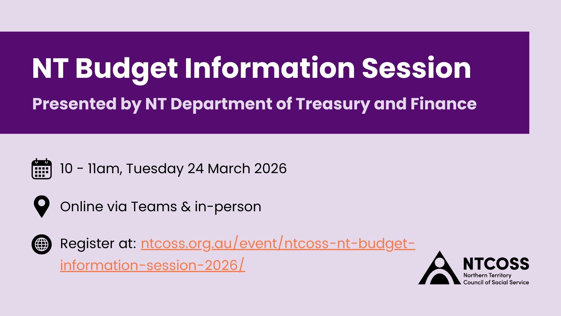 NTCOSS is pleased to invite you to the NT Budget Information Session presented by representatives from the NT Department of Treasury and Finance.