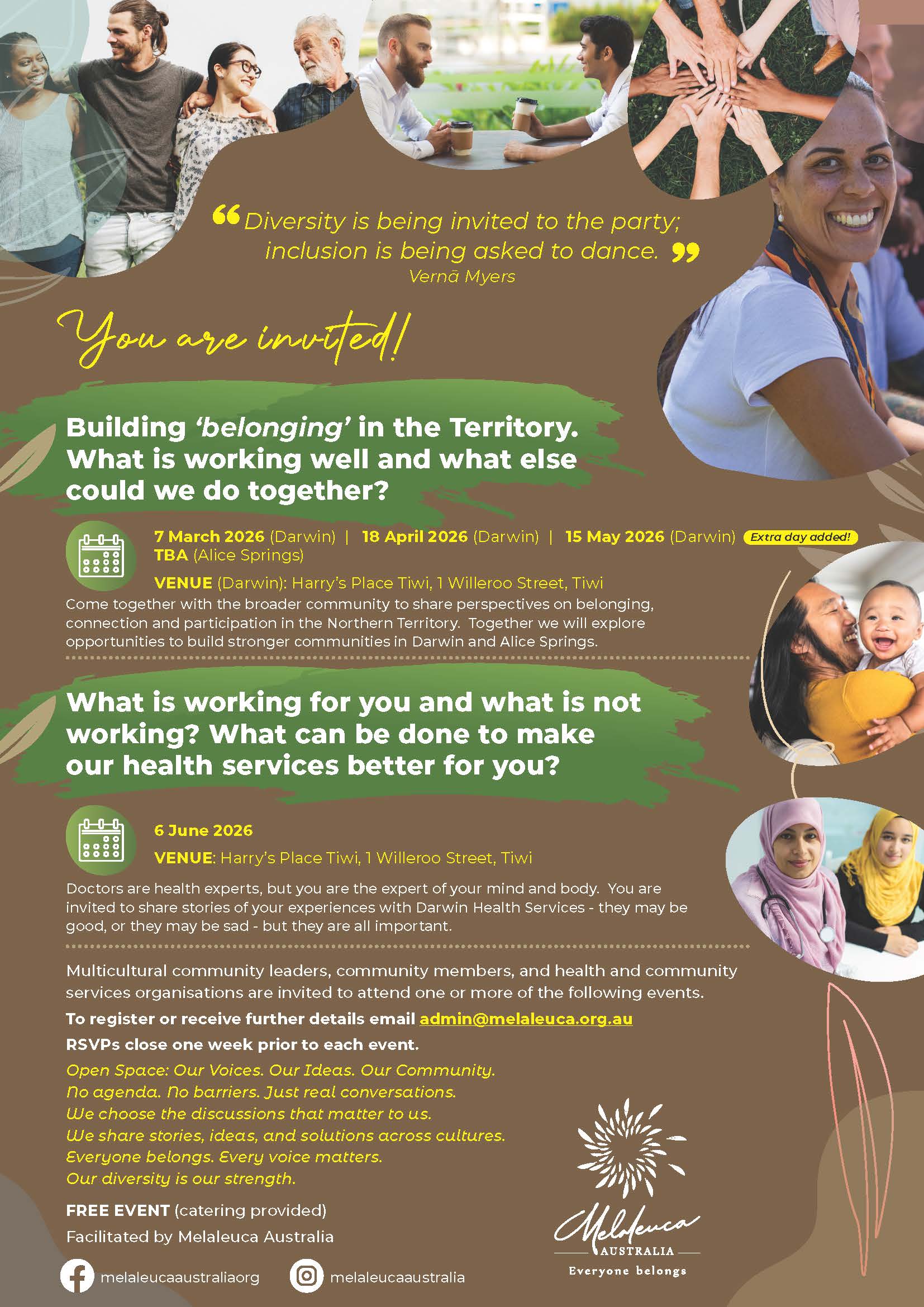 These free events bring together community members, leaders, and service providers to talk about what’s working, what’s not, and how we can strengthen social cohesion, belonging, and health services across the Northern Territory.
