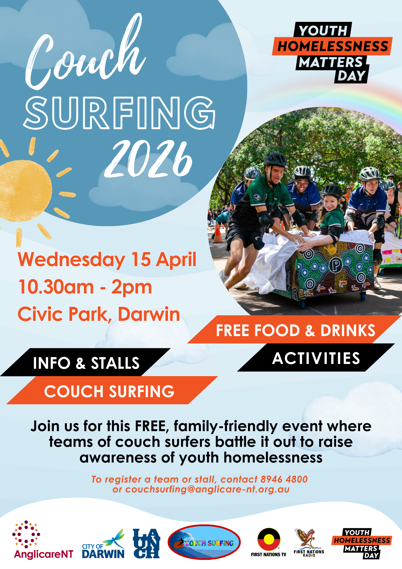 Join us for this FREE, family-friendly event where teams of couch surfers battle it out to raise awareness of youth homelessness To register a team or stall, contact 8946 4800 or email couchsurfing@anglicare-nt.org.au