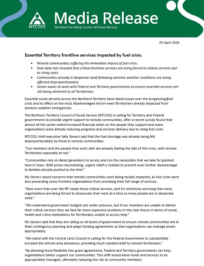 Media Release: Essential Territory frontline services impacted by fuel crisis20/04/26Download the Media Release